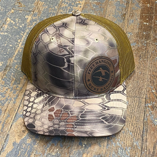 Feet Hanging We're Banging Leather Patch Trucker Ball Cap Camo Bronze