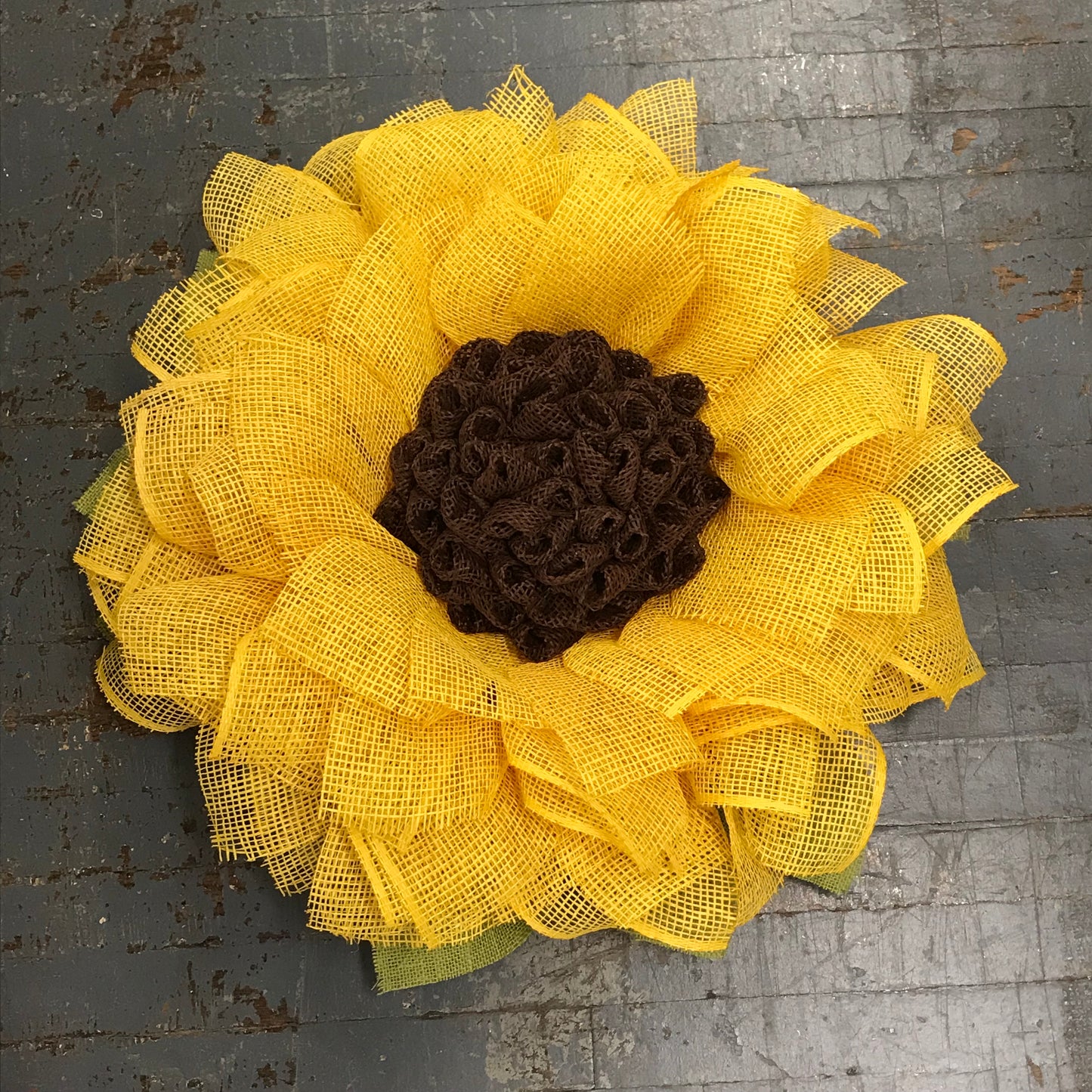 Handmade sunflower wreath is built around a 12" wreath form, offering the shape of a full sunflower with leaves. It has so much character & charm and perfect for any season!