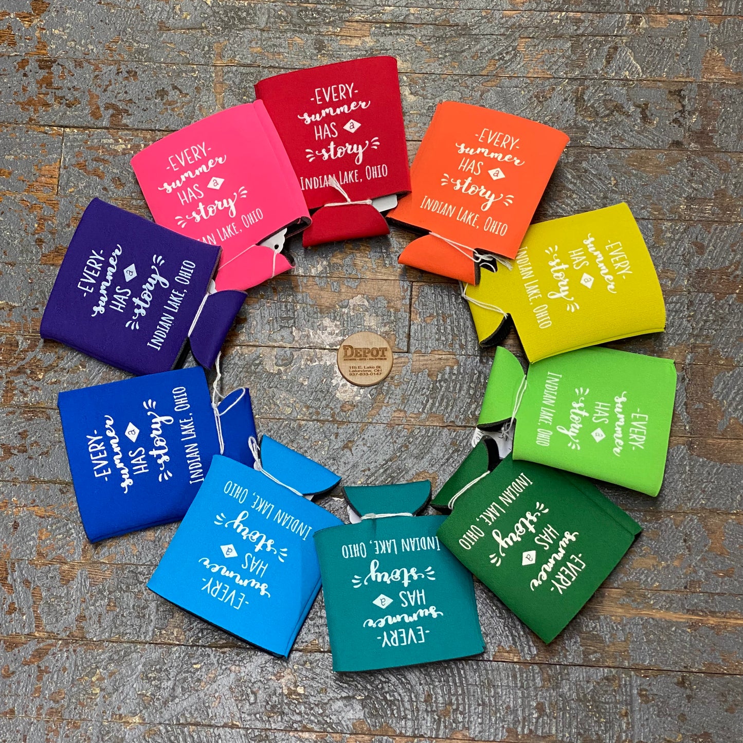 Enjoy a part of Indian Lake where ever you may go with these can hugger drink coozies. Design features Indian Lake Ohio.