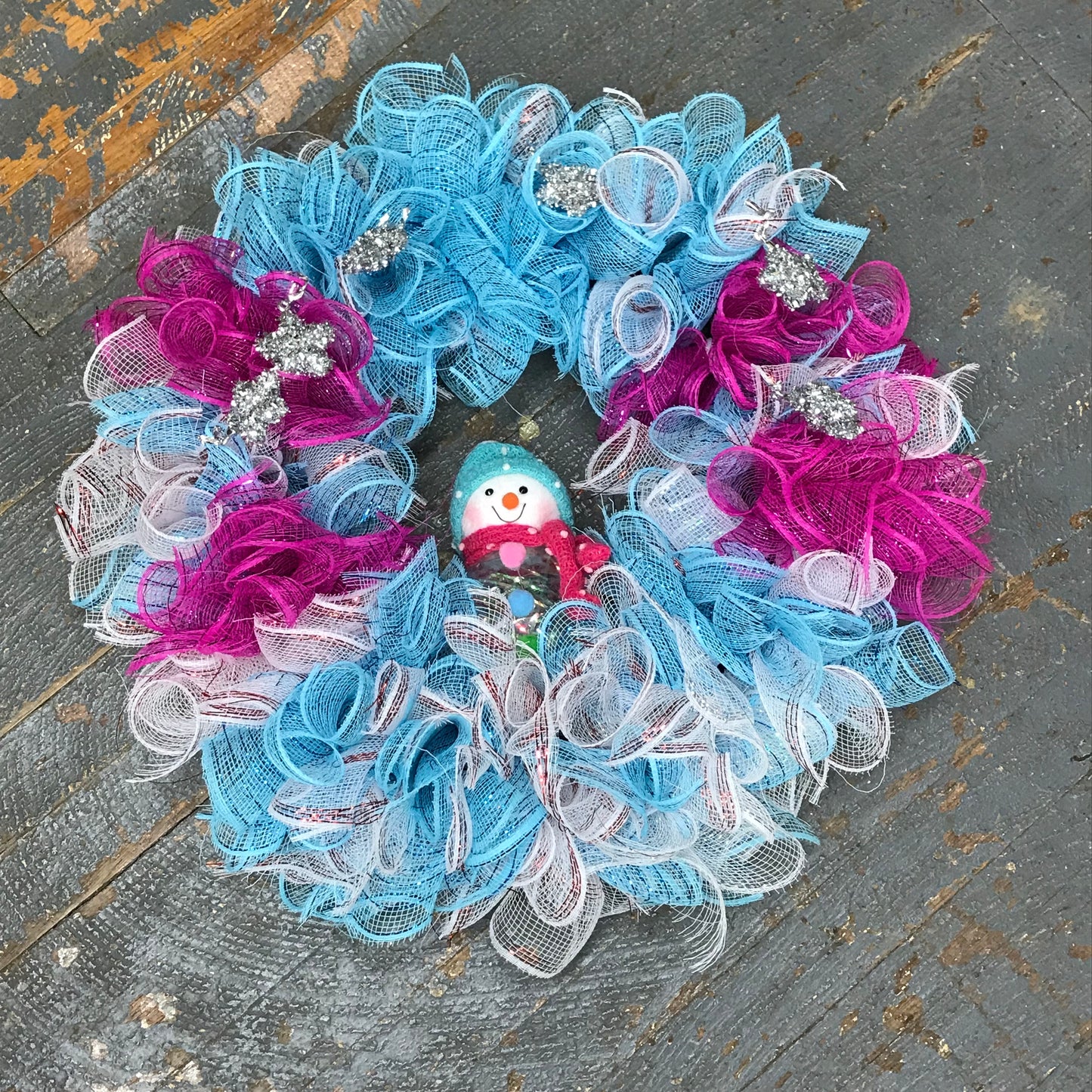 Handmade wreath is built around a wreath form, offering the shape of a traditional round wreath with a frosty winter colors and a snowman in the center. Item has so much character & charm and perfect for the holiday season!