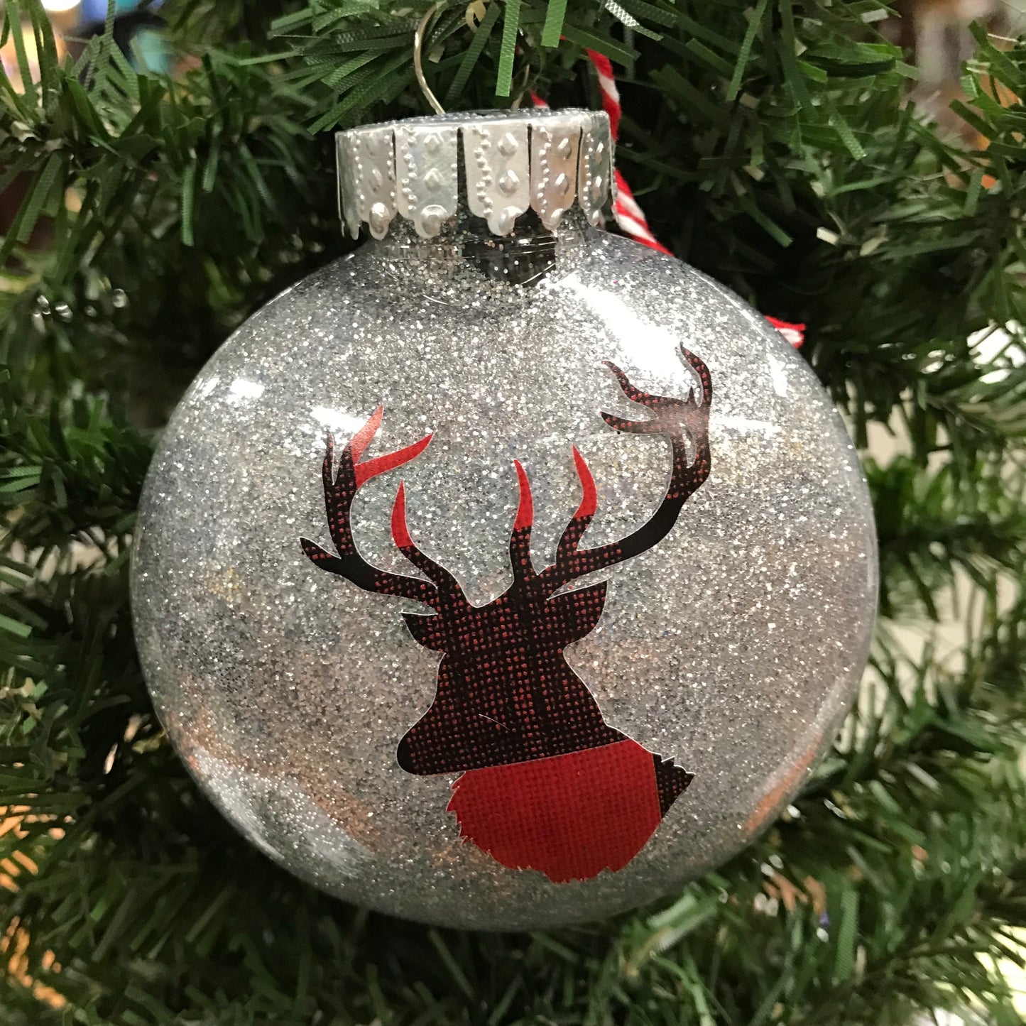 These fun holiday ornaments are thin, round bulbs filled with lots of sparkle and vinyled with your favorite animal.