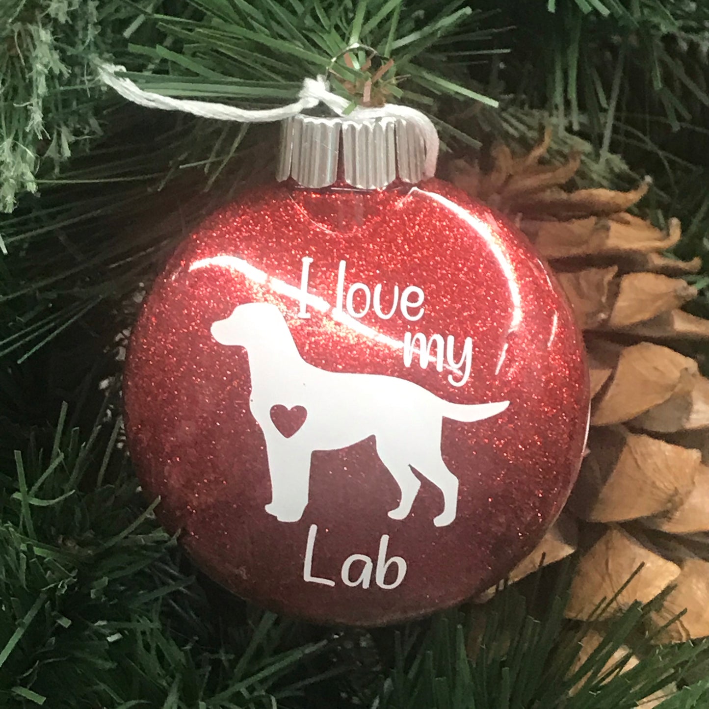 These fun holiday ornaments are thin, round bulbs filled with lots of sparkle and vinyled with "I Love My Lab". Glitter color may vary based on stock.