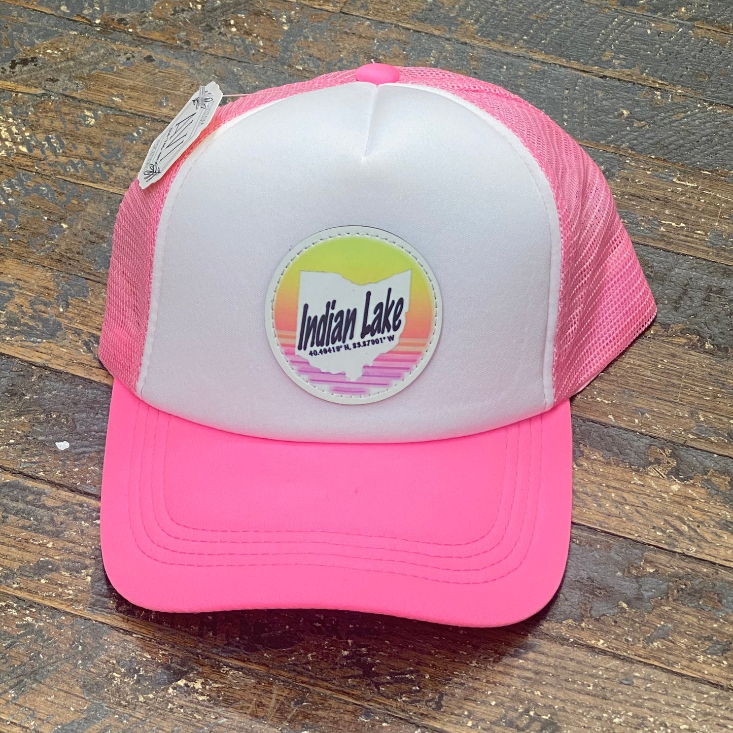 Indian Lake Coordinates Leather Patch Trucker Ball Cap White Neon Pink