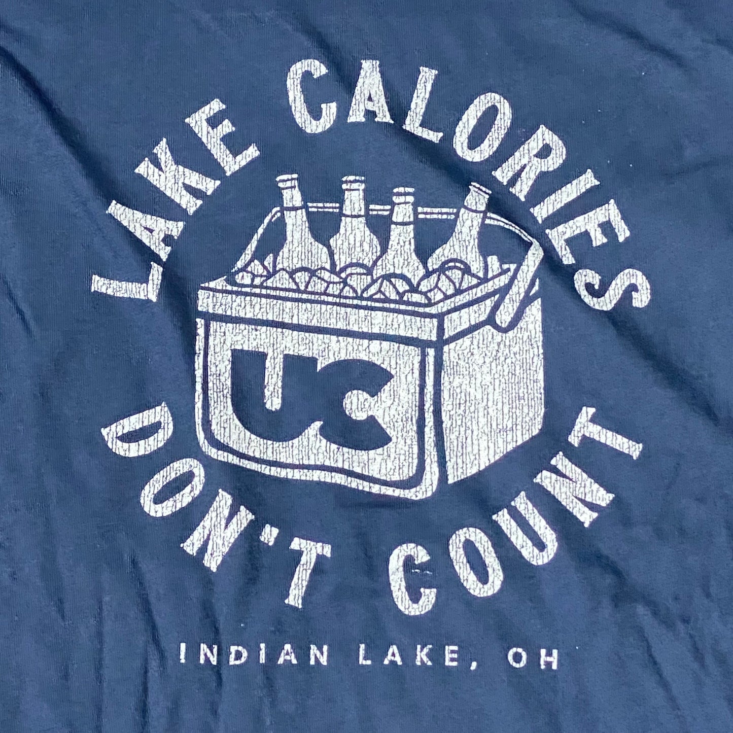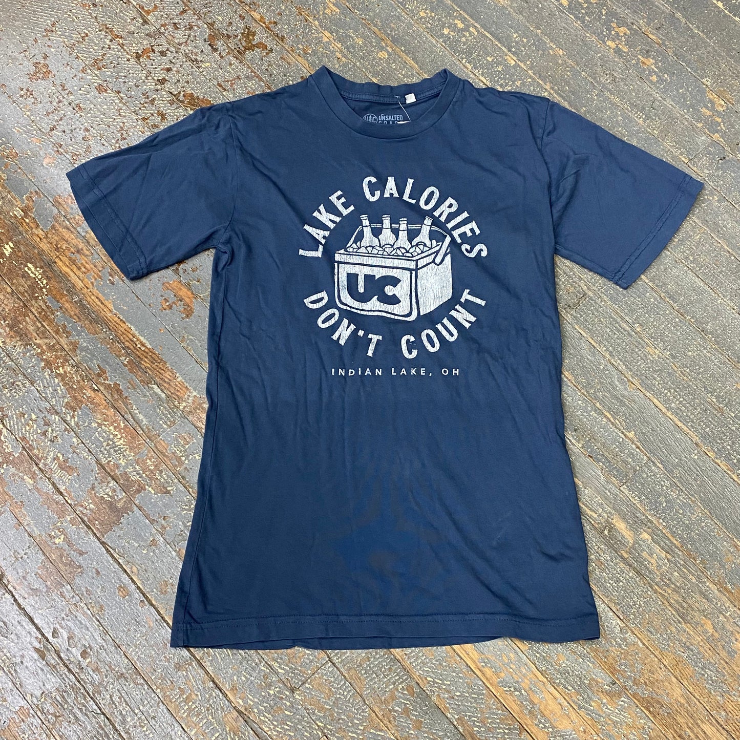 Wear your lifestyle with this Indian Lake, Ohio navy blue short sleeve "Lake Calories Don't Count, Indian Lake, OH" graphic designer t-shirt.