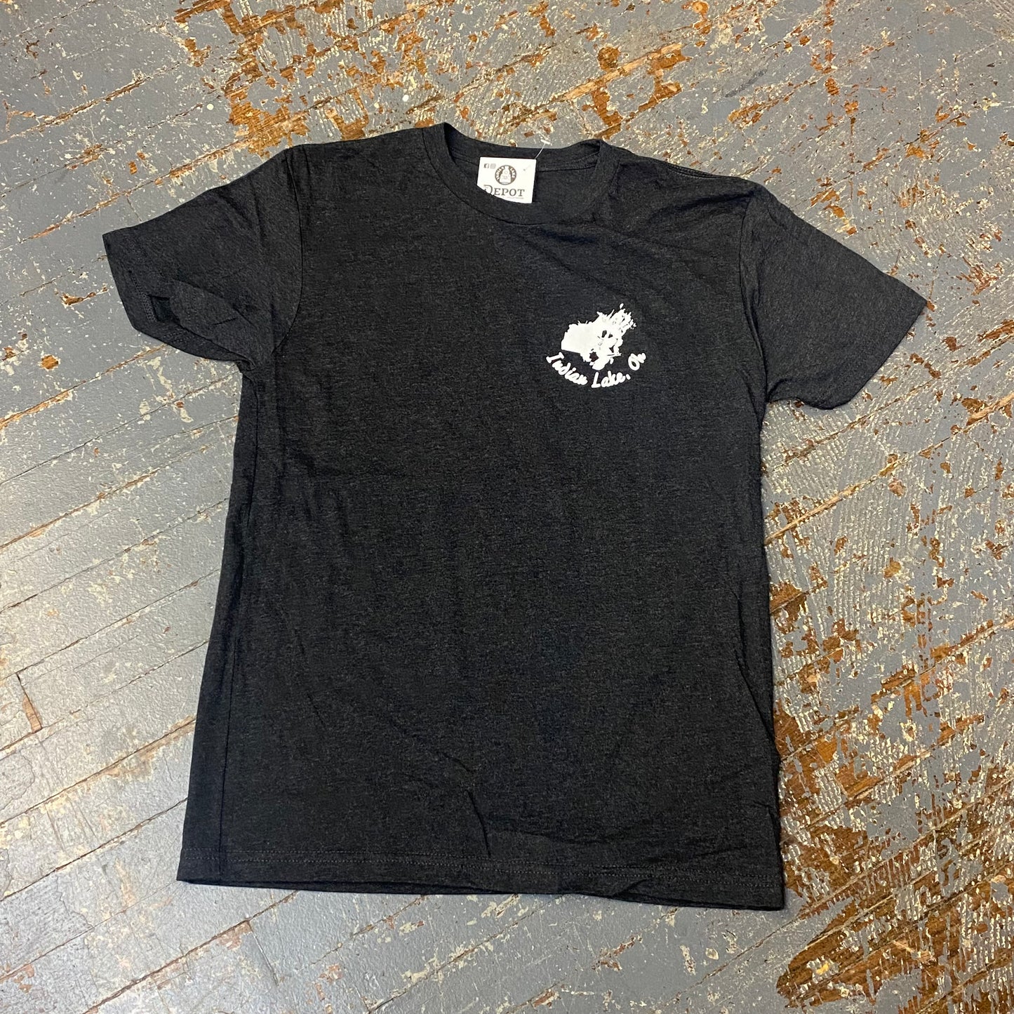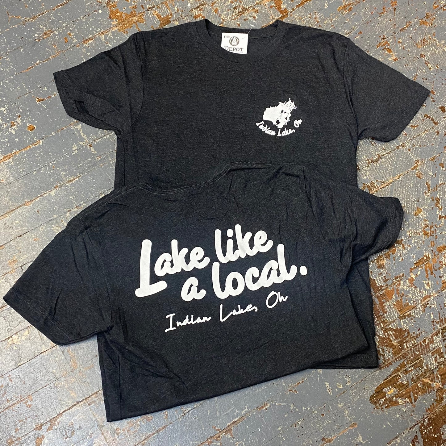 Wear your lifestyle with this Indian Lake, Ohio heather black short sleeve "Indian Lake, Ohio" left front chest and "Lake Like a Local, Indian Lake, Ohio" full back graphic designer t-shirt.