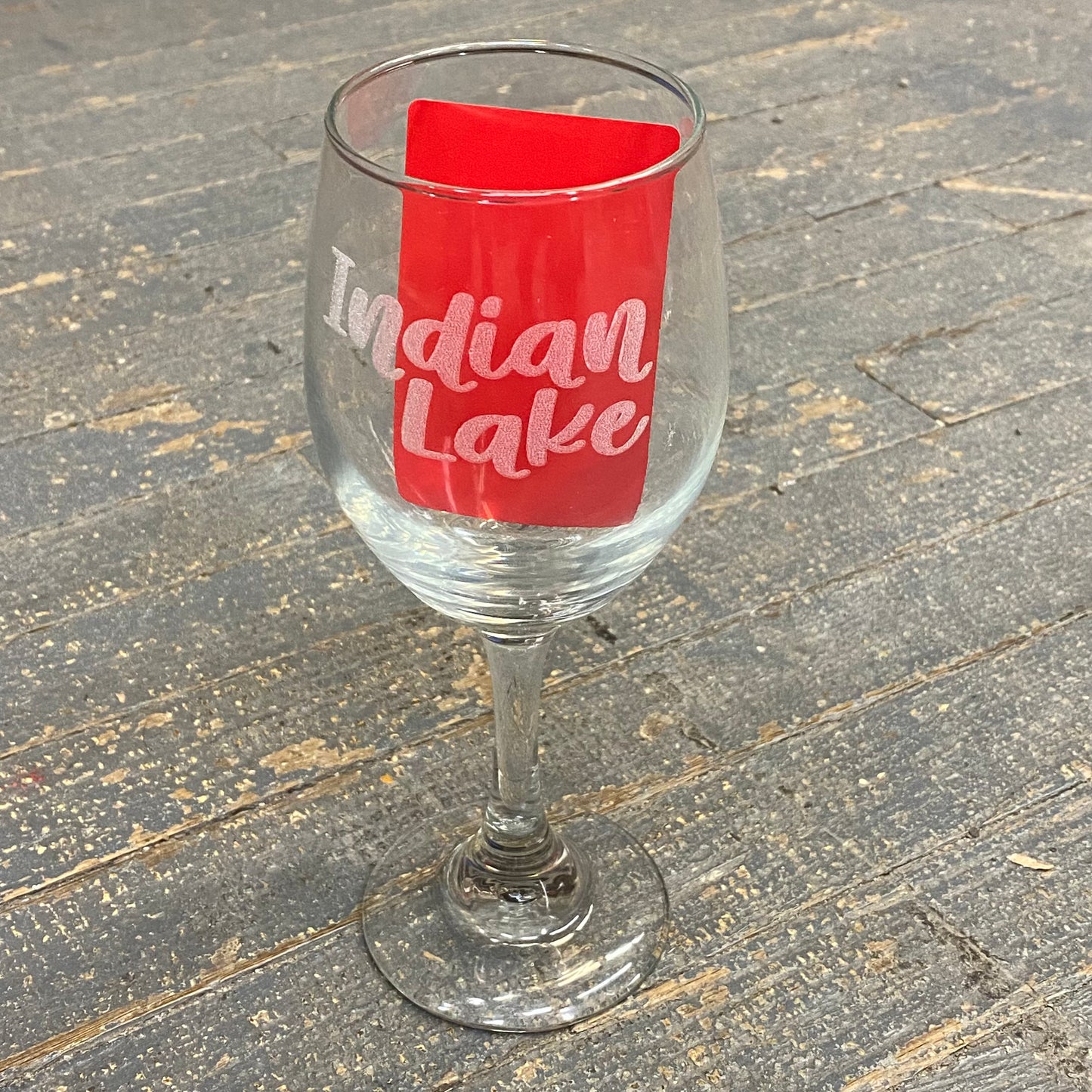 Stemmed wine glass features laser engraved message, "Indian Lake".