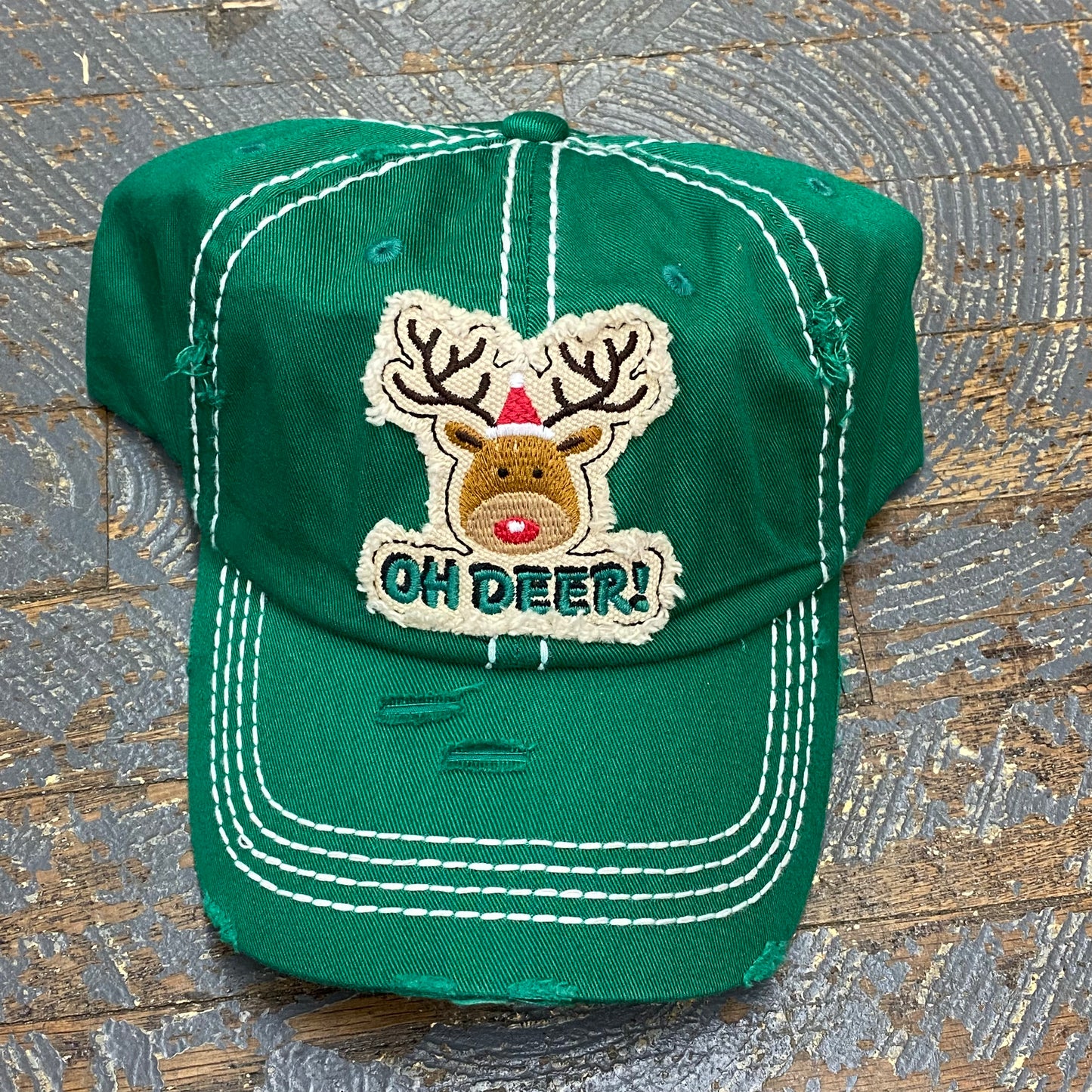 Oh Deer Reindeer patch baseball cap in a rugged green ball cap.