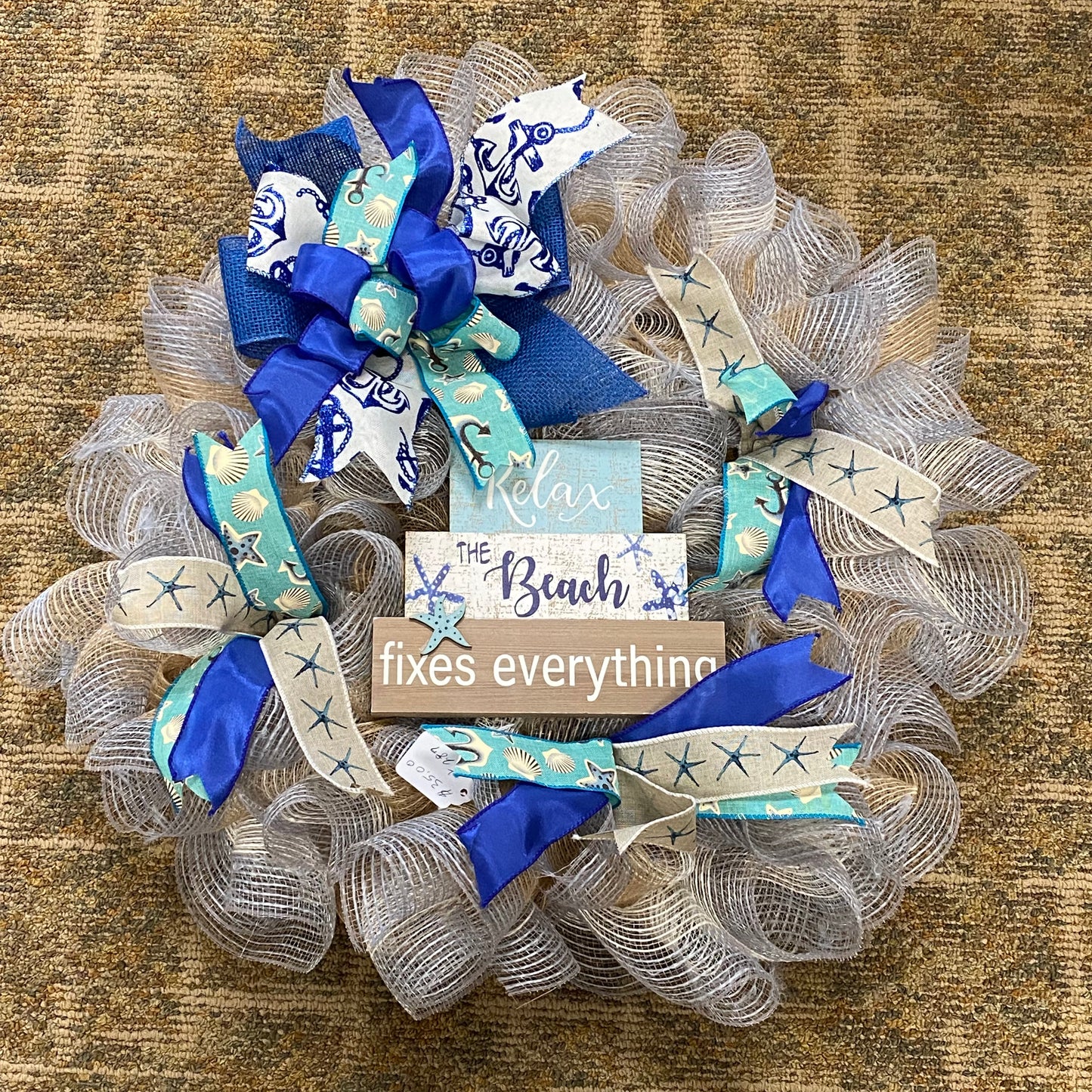Handmade wreath is built around a wreath form, offering the shape of a traditional round wreath with a wooden "Relax the Beach Fixes Everything" sign across the front. Item has so much character and charm, perfect for the holiday season!