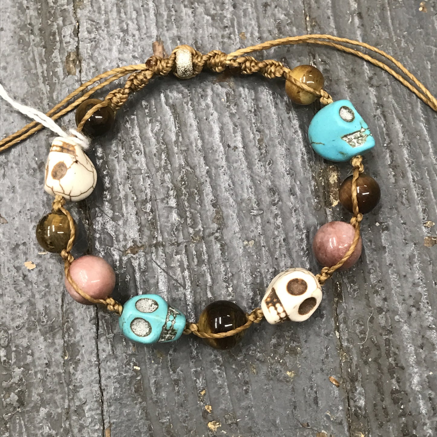 Hand crafted semi-precious gemstone bracelets feature hand drilled gems and braided cord. Howlite and turquoise skulls, tiger eye and morganite gem stones.