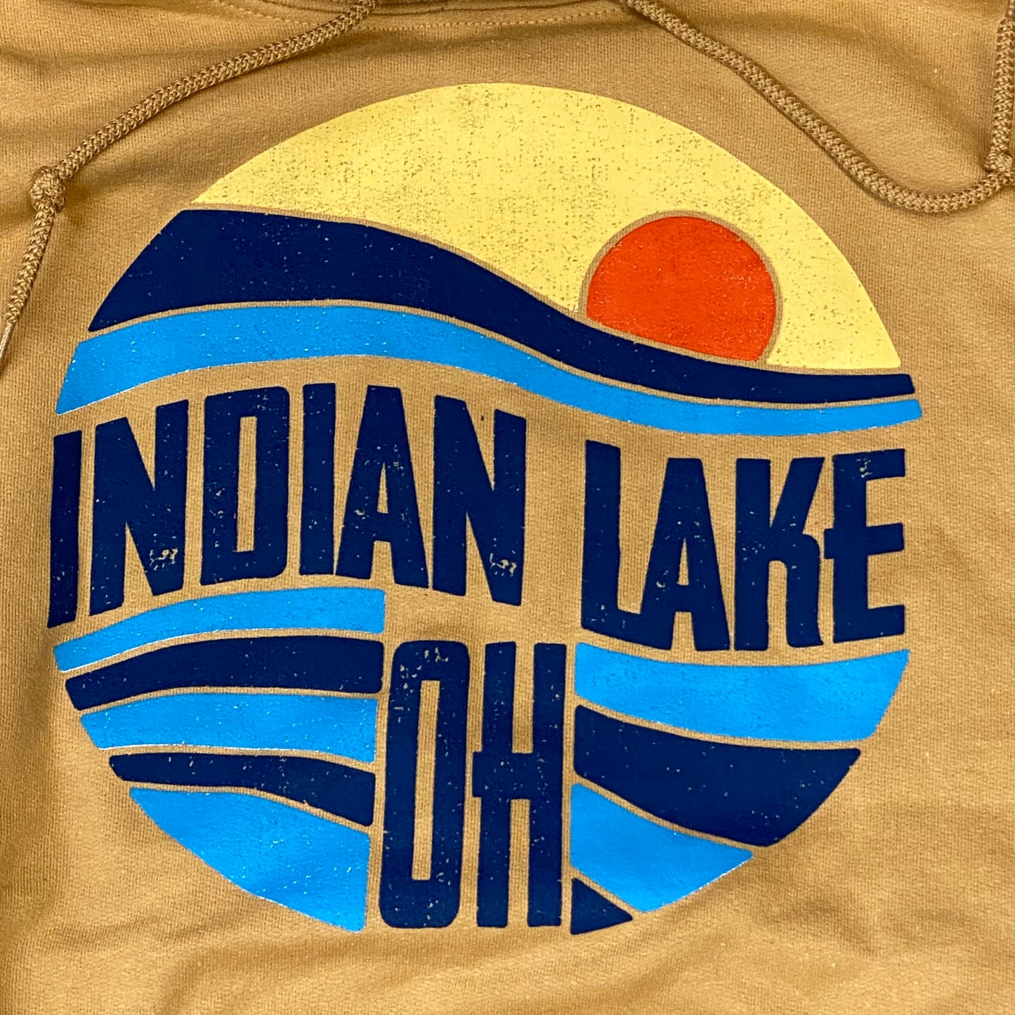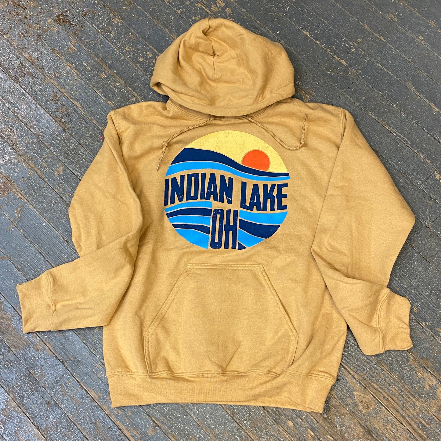 Wear your lifestyle with this Indian Lake, Ohio gold long sleeve "Indian Lake, OH" graphic designer hoody.
