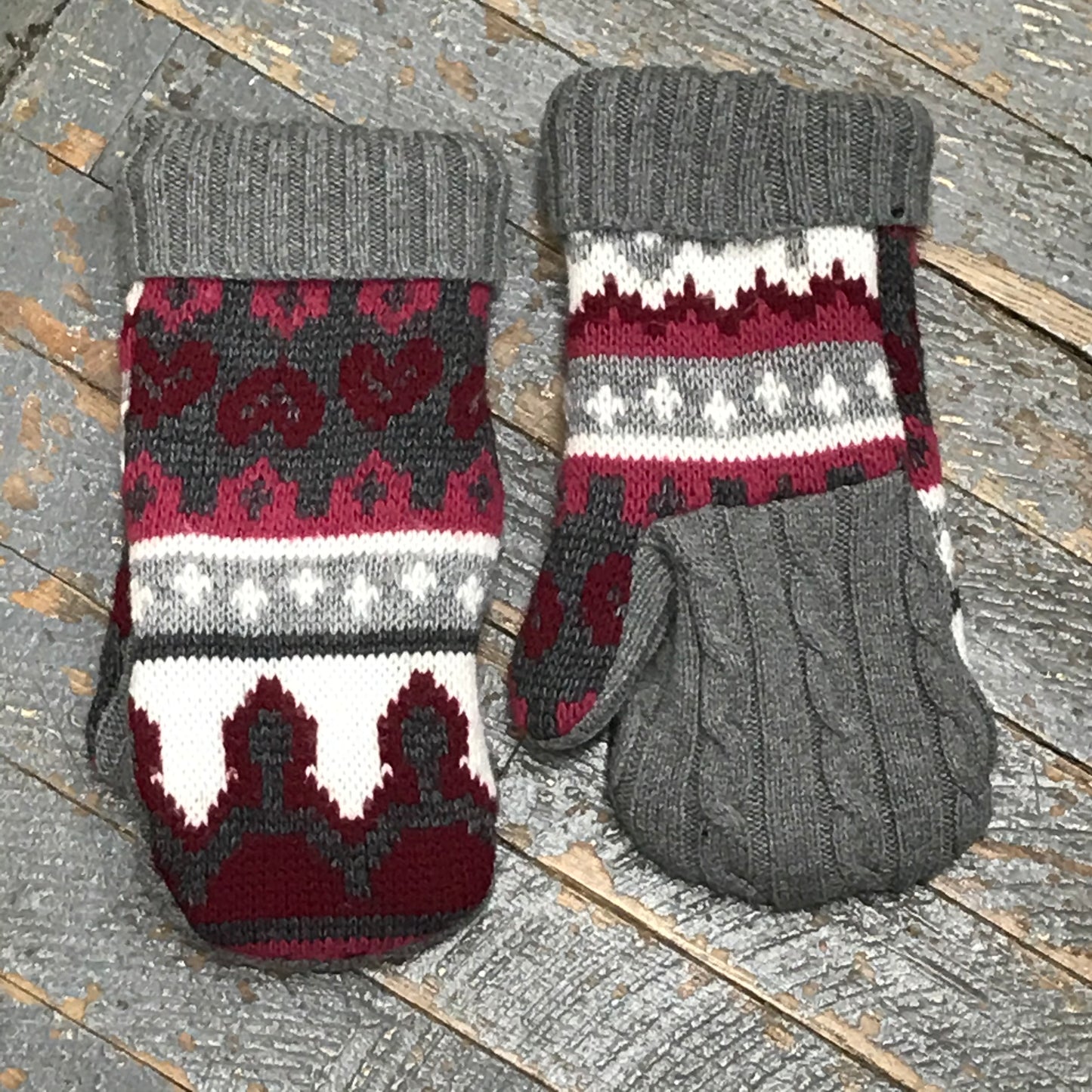 Upcycled Sweater Fleece Lined Mittens Grey Maroon Hearts